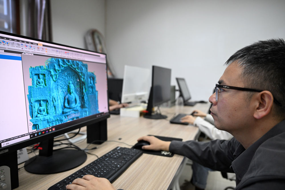2025年4月10日,龙门石窟研究院工作人员进行3D建模工作。
