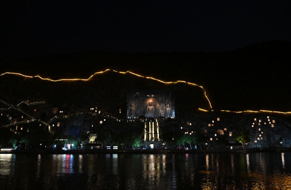 2025年4月24日,游客在龙门石窟夜游。