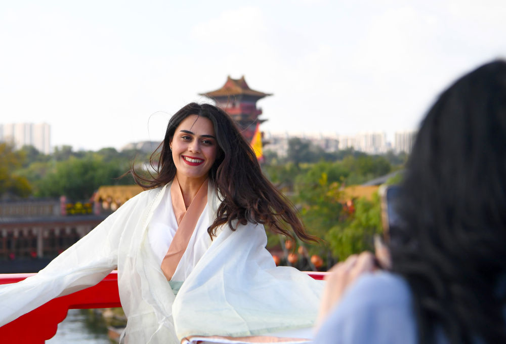 2024年10月18日,外国游客在清明上河园内游玩。