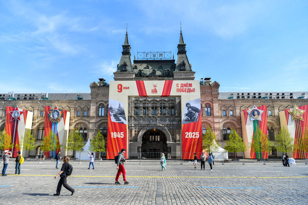 纪念苏联伟大卫国战争胜利80周年庆典前夕,莫斯科街头,写有“胜利”字样的旗帜随风飘扬。在路边,以苏联卫国战争历史为主题的图片展板和装饰橱窗吸引行人停下脚步,或合影留念,或浏览沉思。