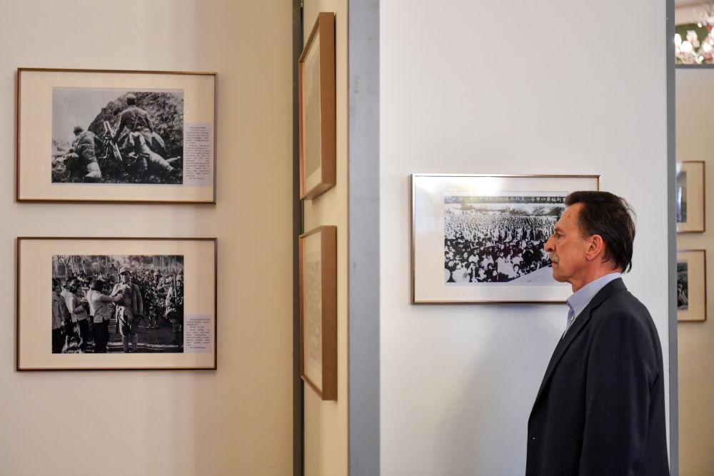 4月18日,在俄罗斯首都莫斯科,嘉宾参观纪念中国人民抗日战争暨世界反法西斯战争胜利80周年图片展。新华社记者 曹阳 摄