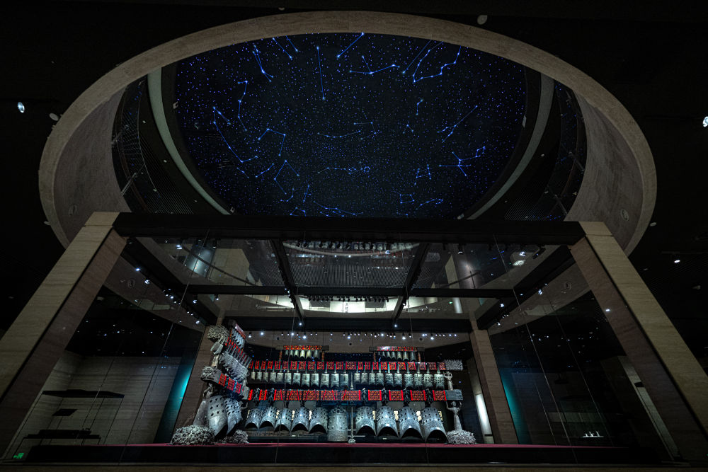 在湖北省博物馆拍摄的随州曾侯乙编钟(2025年4月17日摄)。曾侯乙编钟是我国出土数量最多、重量最重、音律最全、气势最为宏伟的一套编钟,编钟上的铭文是目前已知唯一的中国先秦官方音乐理论文献,以声音和文字相互印证的方式保存了2400多年前人类的音乐记忆。