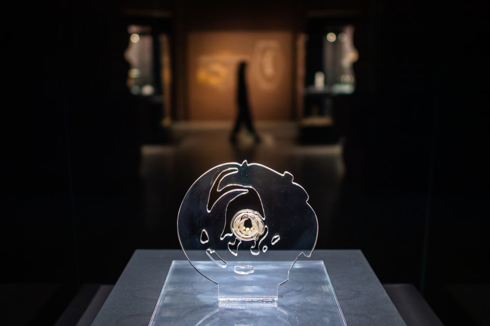 在武汉盘龙城遗址博物院拍摄的玉团凤(2024年3月30日摄)。1955年,玉团凤于湖北天门石家河遗址出土,造型秀美,线条遒劲流畅,被誉为“中华第一凤”。石家河遗址距今约5000年,是长江中游同期规模最大的聚落。