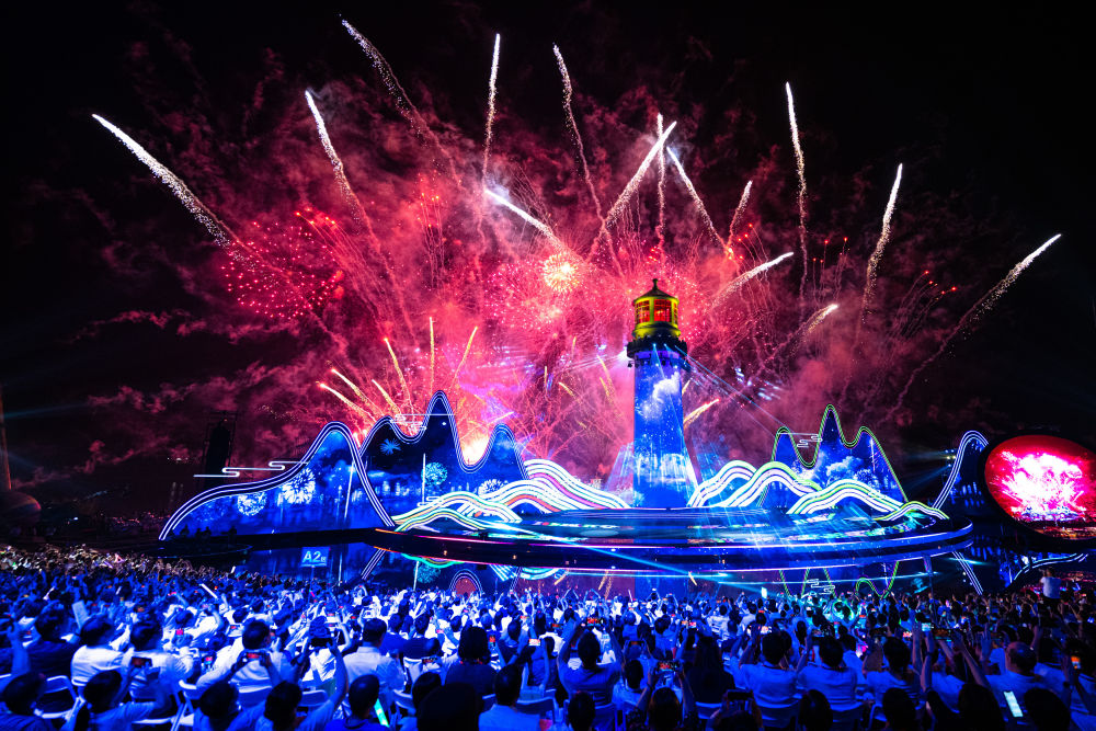 2023年9月16日,第十四届中国长江三峡国际旅游节在湖北宜昌市灯塔广场开幕,这是观众在开幕式现场观看表演。生态搭台、文旅唱戏,长江三峡国际旅游节是近些年三峡库区把绿水青山转变成“金山银山”的生动写照。