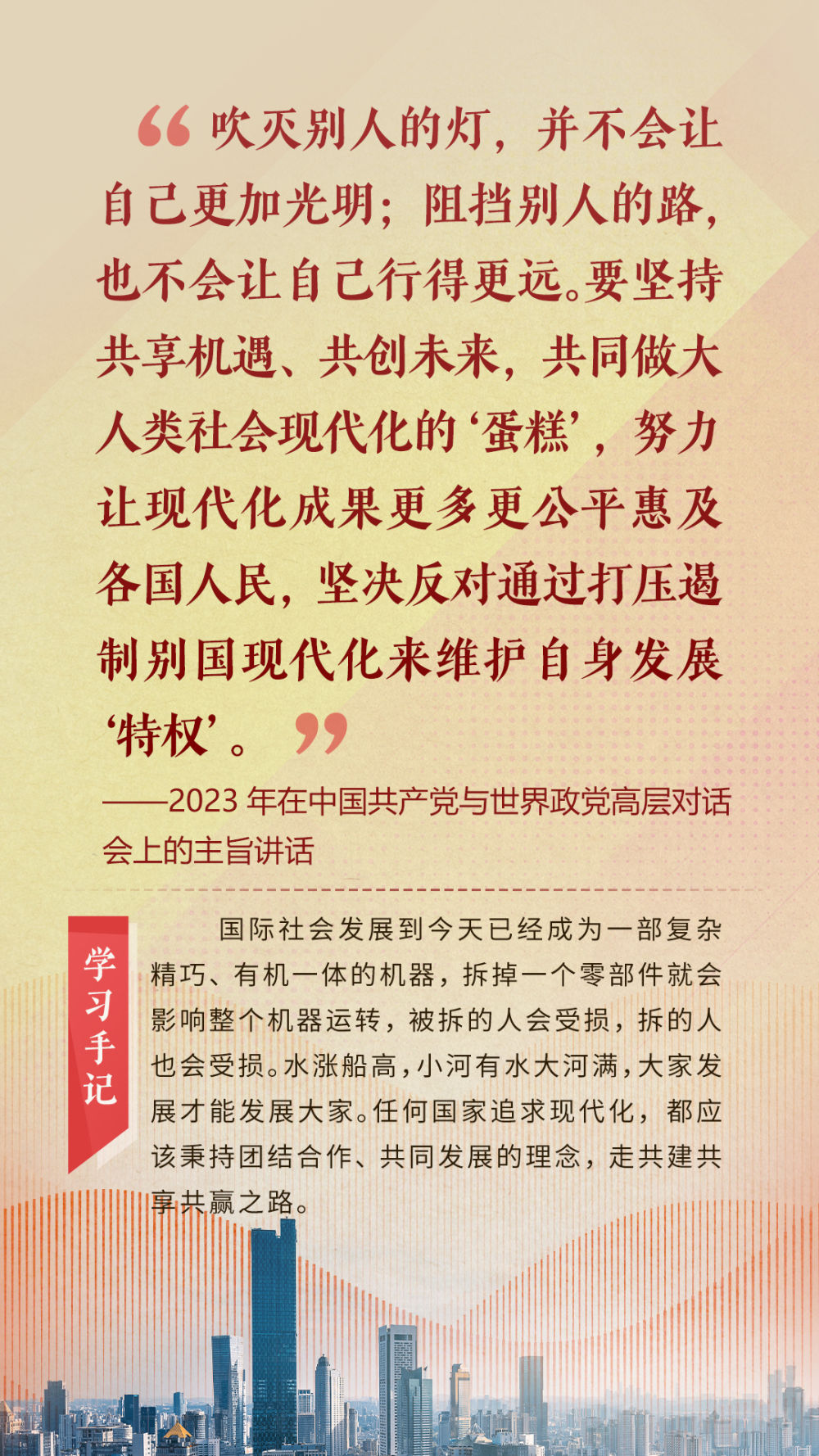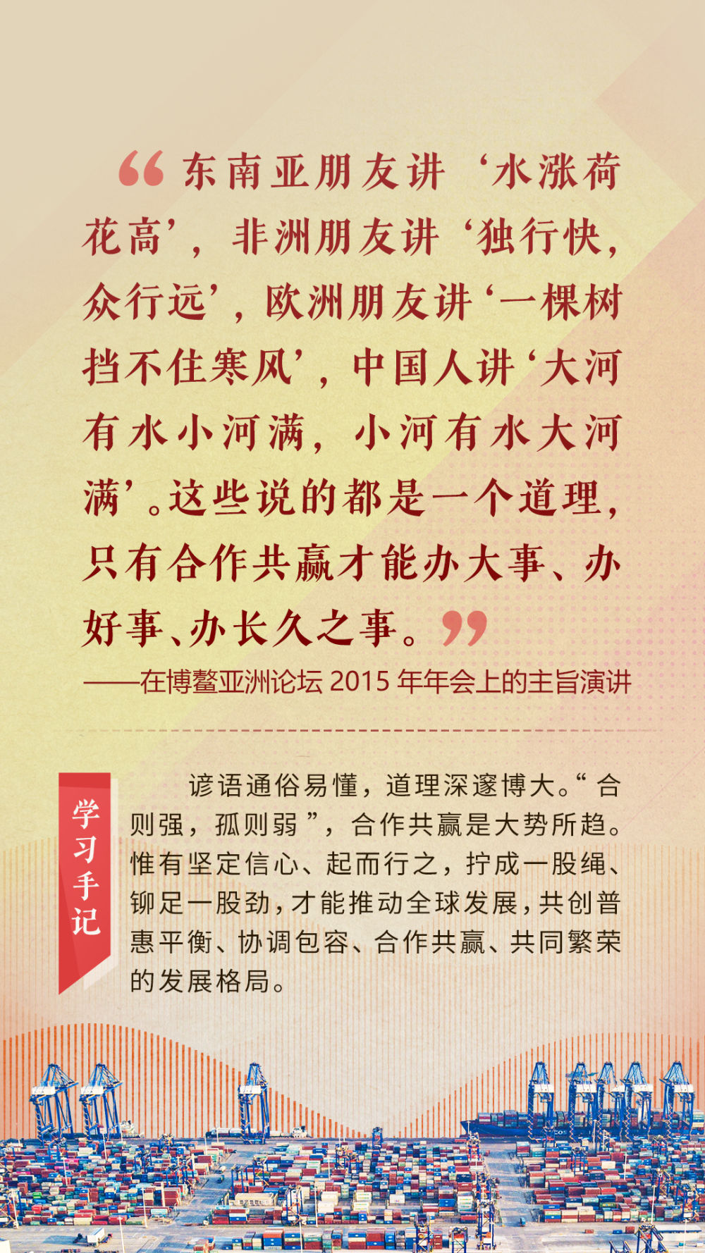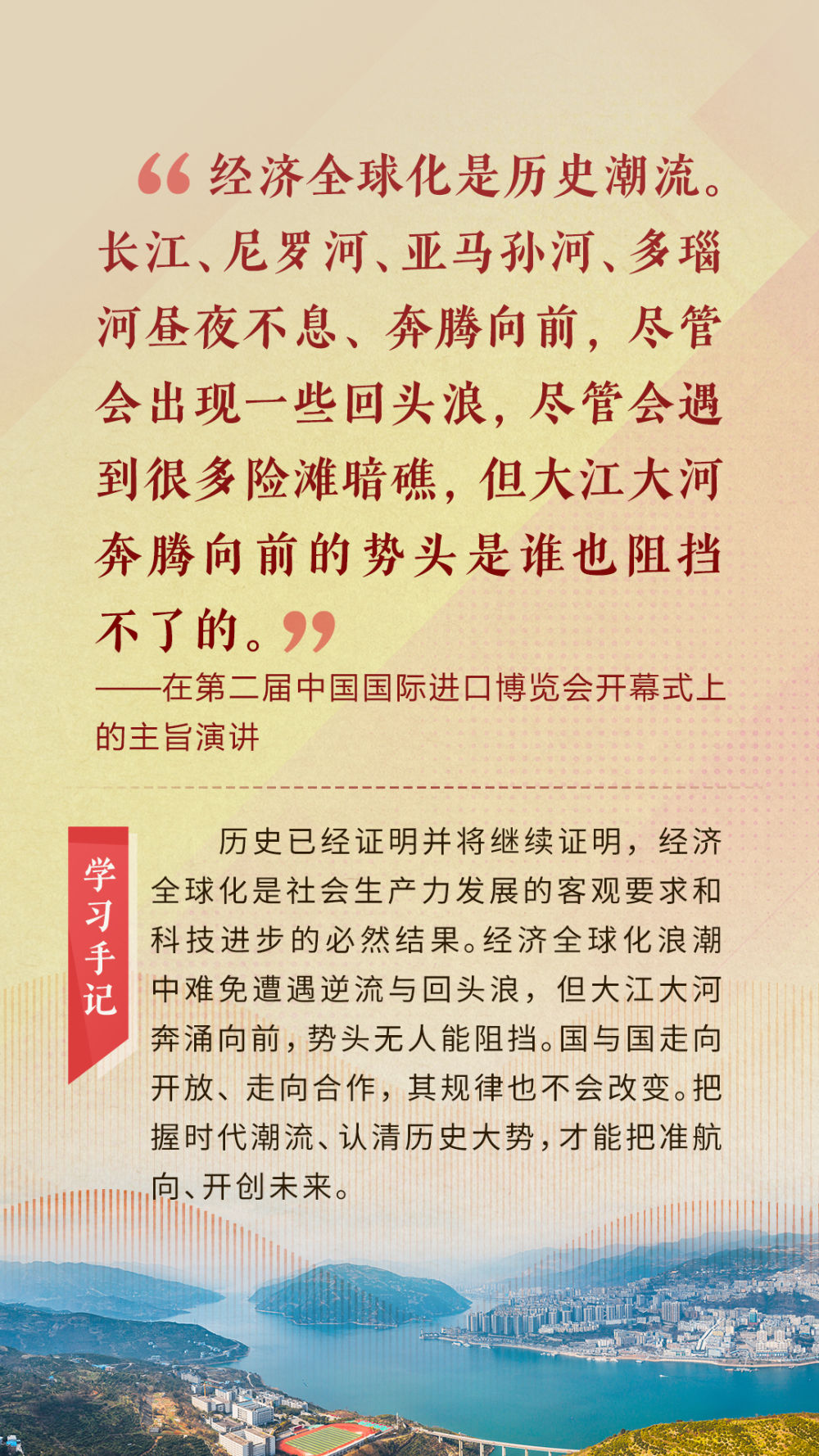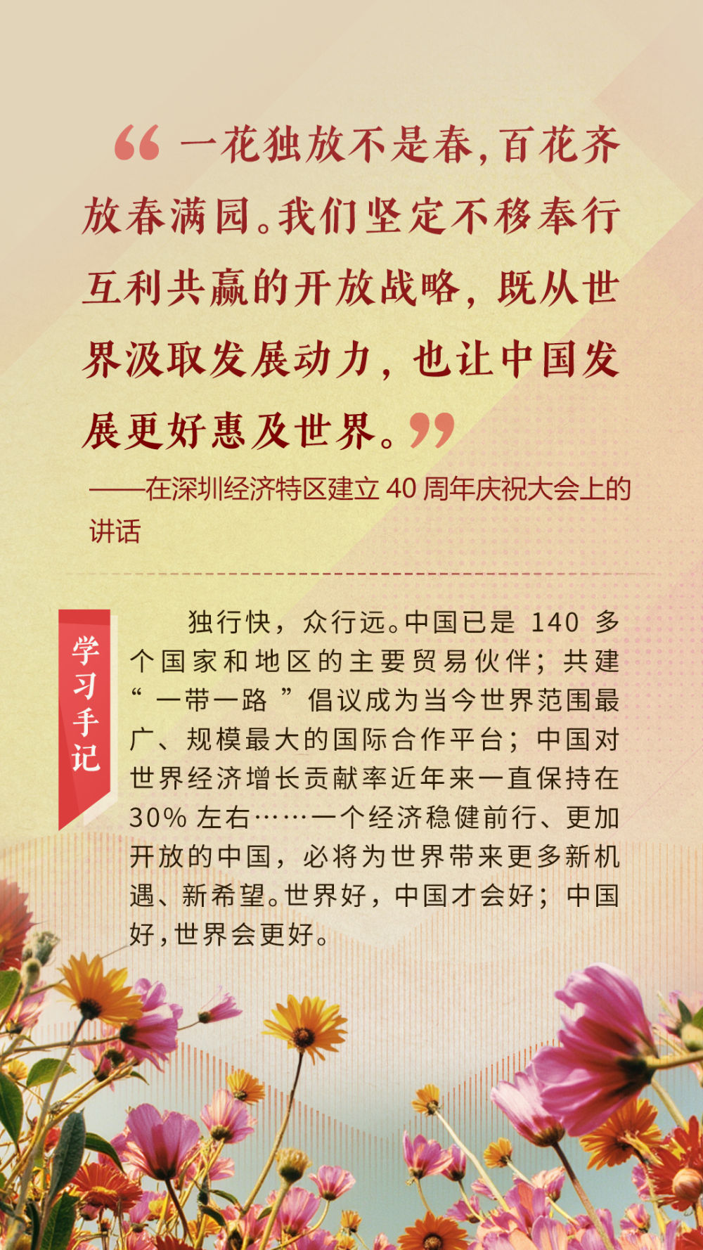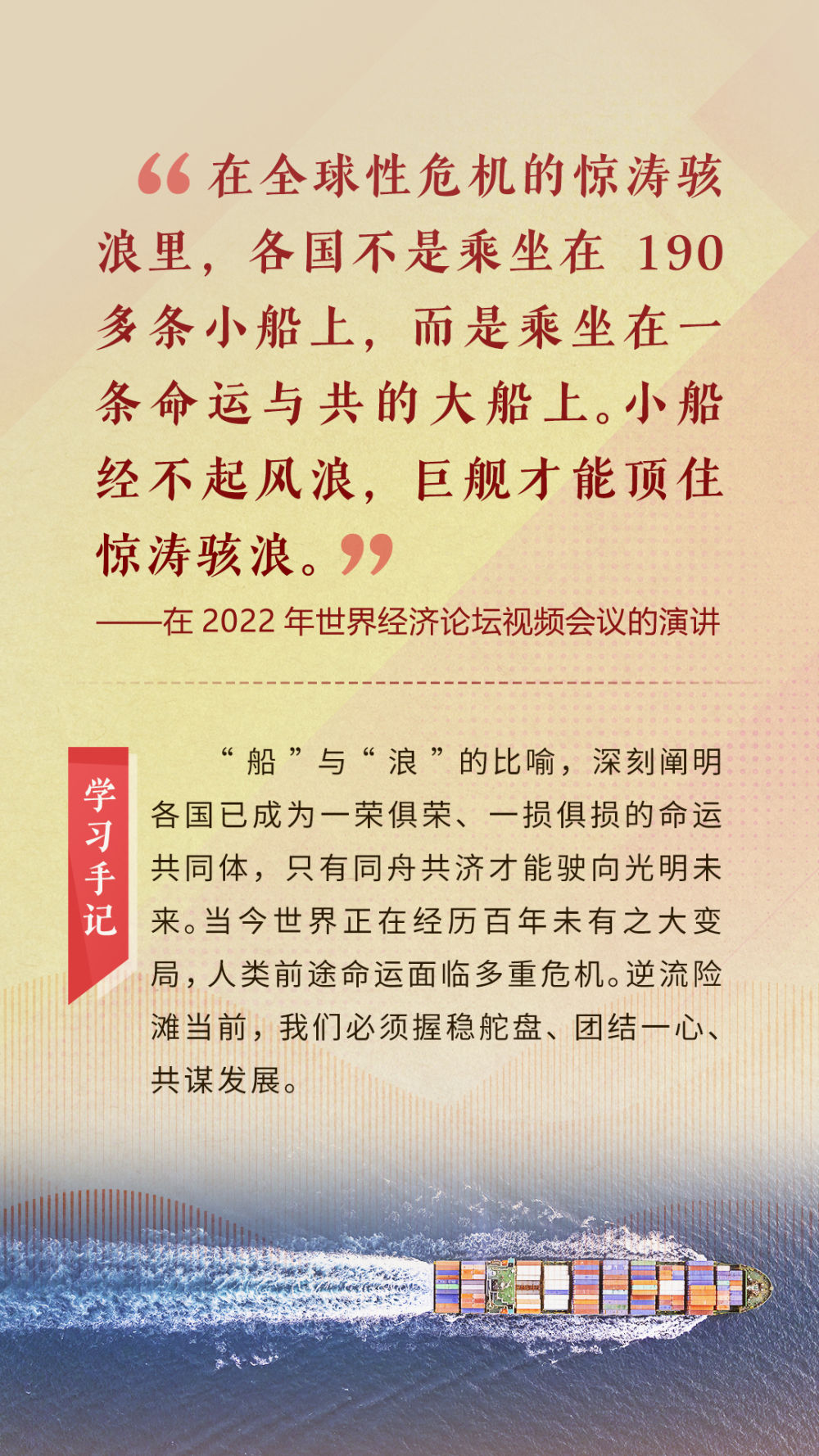 “天空足够大,地球足够大,世界也足够大,容得下各国共同发展繁荣”“你中有我、我中有你的命运共同体”“与中国同行就是与机遇同行”……习近平总书记一次次在重要场合发表重要讲话,指引我们站在历史正确的一边,站在人类进步的一边,不畏浮云、登高望远,不惧风浪、勇毅前行。