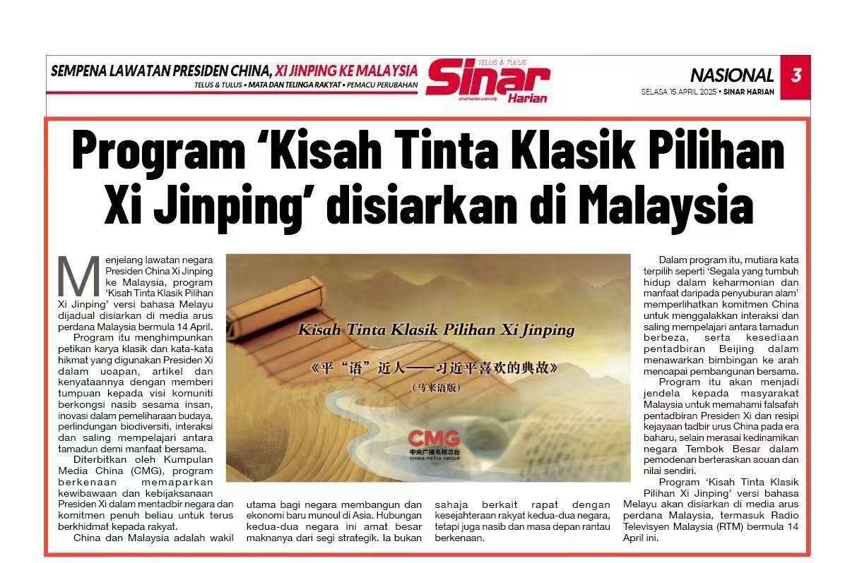 4月15日,马来西亚中文、英文、马来文主流媒体《星洲日报》《星报》《阳光日报》分别刊发节目在马来西亚落播的消息。文章指出,《平“语”近人——习近平喜欢的典故》(马来语版)特别选取了“万物各得其和以生,各得其养以成”等典故,生动阐释中国坚持不同文明之间平等交流、互学互鉴,愿意为人类破解时代难题、实现共同发展提供强大的精神指引,有助于马来西亚民众更好读懂新时代中国之治的成功密码,感知中国式现代化蓬勃发展的强劲脉动。