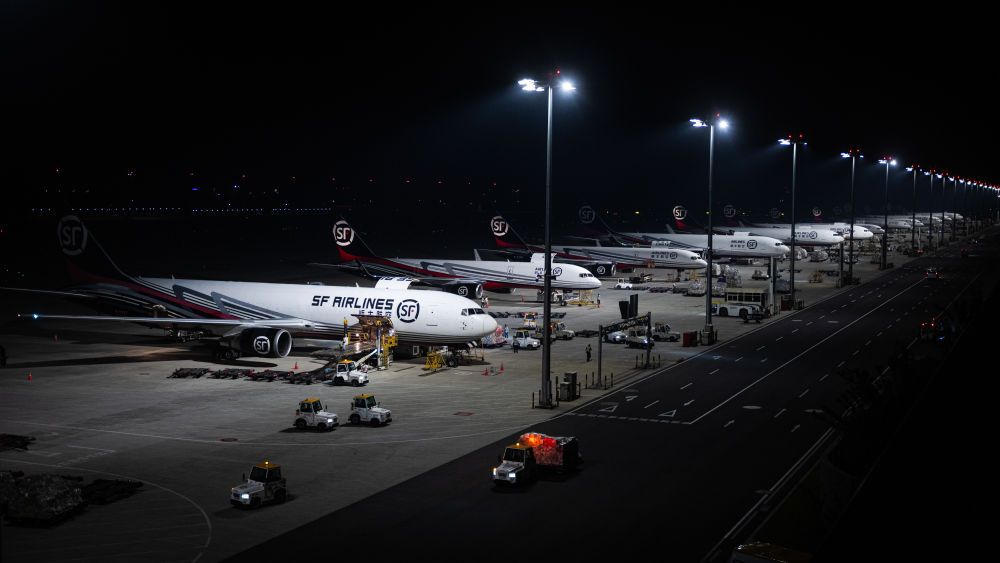2024年5月25日凌晨,工人在湖北鄂州花湖国际机场停机坪装卸货物。鄂州花湖国际机场于2022年7月建成投运,是亚洲首个专业货运枢纽机场。截至2025年1月26日,鄂州花湖国际机场已开通37条国际货运航线和66条国内货运航线。
