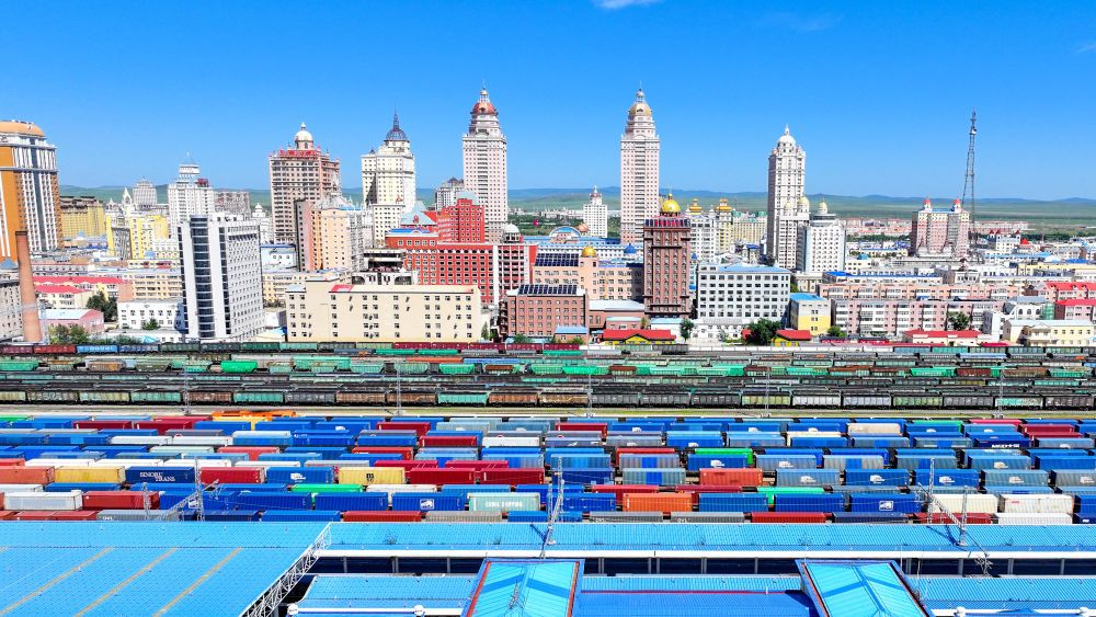2024年8月20日,中欧班列在内蒙古满洲里口岸准备出境(无人机照片)。满洲里口岸位于中俄蒙三国交界处,是中国最大的陆路口岸,也是连接俄罗斯、蒙古国的重要枢纽。2024年,满洲里口岸中欧班列通行量突破4000列,为推进高质量共建“一带一路”注入新动能。