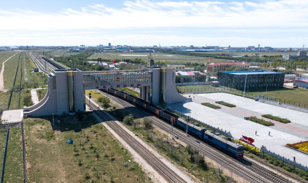 2024年9月11日,列车驶出内蒙古二连浩特铁路口岸(无人机照片)。二连浩特口岸是中国对蒙古国开放的最大陆路口岸,也是中欧班列“中通道”唯一进出境口岸。二连浩特铁路口岸出入境中欧班列运载货物种类丰富,涵盖轻纺产品、电子电器、机器配件、国产汽车、日用品等。