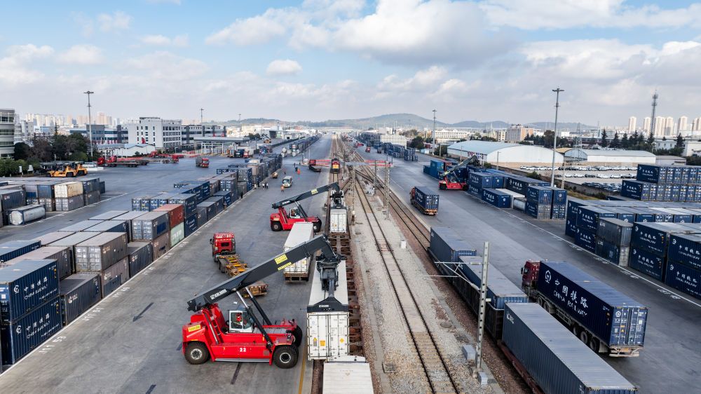 2025年1月2日,中老铁路国际货物列车在云南昆明王家营西站进行装箱作业。自2021年12月3日全线开通运营以来,中老铁路跨境货物运输总量超过1100万吨,跨境货物列车每日开行数量由开通时的2列增加到18列,列车牵引吨数由2000吨增至2500吨。