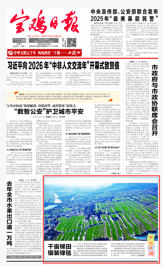 1月9日,冬雪初霁,陈仓区贾村镇东坡村的千余亩梯田,因“银装绿毯”景致意外走红。