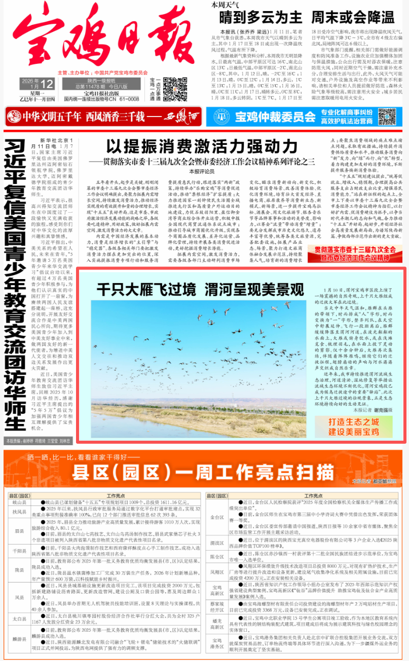 近年来,我市持续推进渭河流域生态治理,河道清淤、湿地修复等举措让流域生态环境不断优化,渭河宝鸡段已成为候鸟迁徙途中的重要“驿站”。此次上千只大雁过境的壮观景象,正是生态环境持续向好的生动见证。