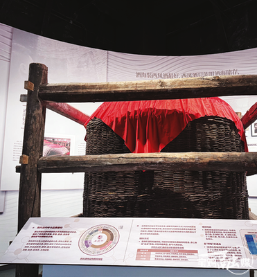 好酒“三分酿七分藏”。展厅内,一口外形酷似巨大木桶的容器引人驻足。这个储酒容器是西凤酒集团的“传家宝”酒海。凑近观察,酒海外框由深山荆条手工编织而成,纹理交错间尽显古法工艺的精妙。“首先用荆条编织成框架,再用新鲜豆腐填充缝隙,这一步看似简单,实则需要工匠精准把控豆腐的湿度与厚度,才能保证密封性。”讲解员说,随后,用麻构纸、白棉布蘸取由血料和鸡蛋清制成的天然黏合剂层层裱糊,整个过程要重复150多层,每一层都必须均匀平整,不能有丝毫瑕疵。裱糊完成后,还要经过数月自然晾干,最后用菜籽油混合蜂蜡加热成膏状,均匀涂刷内壁进行密封,这样才算完成一件合格的酒海。