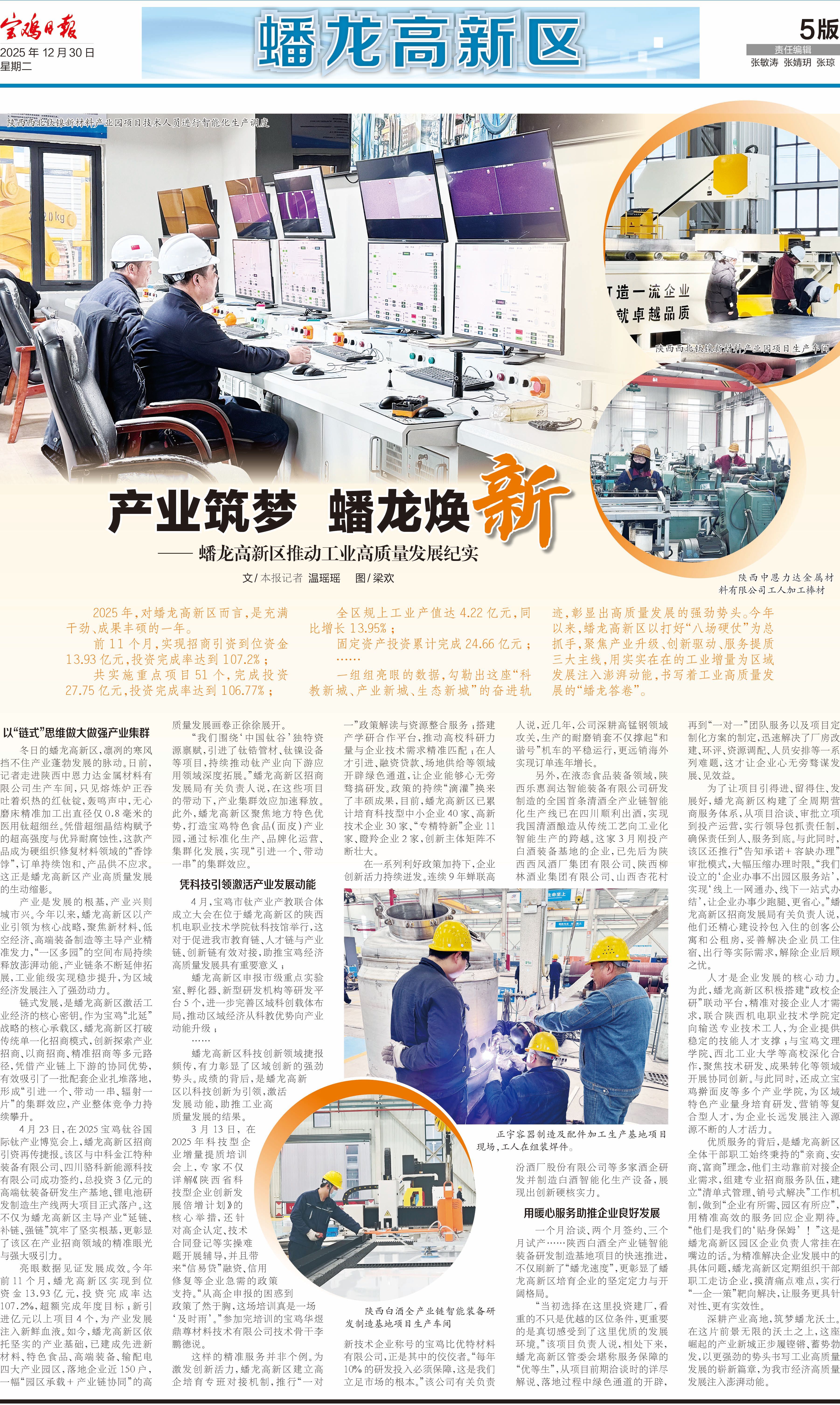 “我们围绕‘中国钛谷’独特资源禀赋,引进了钛锆管材、钛镍设备等项目,持续推动钛产业向下游应用领域深度拓展。”蟠龙高新区招商发展局有关负责人说,在这些项目的带动下,产业集群效应加速释放。此外,蟠龙高新区聚焦地方特色优势,打造宝鸡特色食品(面皮)产业园,通过标准化生产、品牌化运营、集群化发展,实现“引进一个、带动一串”的集群效应。
