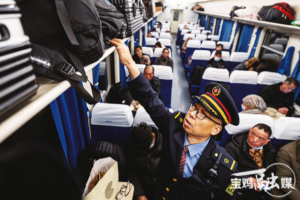 冬日的秦岭,静谧安然,6063/6064次绿皮小慢车悠闲穿行,从陕西宝鸡至四川广元,每天往返一趟。上午9时,53岁的罗宝成站在6063次绿皮小慢车内,对着镜子仔细整理着列车长制服、收拾物品,做着发车前的准备。“旅客们,大家好,欢迎乘坐6063次列车……”9时30分,罗宝成的声音在车厢里响起,温暖而有力。
