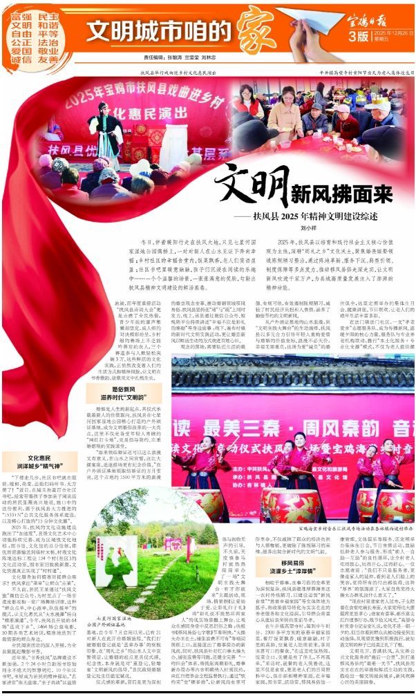 文明花开,香满扶风。从完善公共文化服务的“最后一公里”,到打通移风易俗的“最难一关节”,扶风县用实实在在的举措和鲜活生动的实践,描绘出一幅文明浸润城乡、新风吹拂心田的美丽画卷。