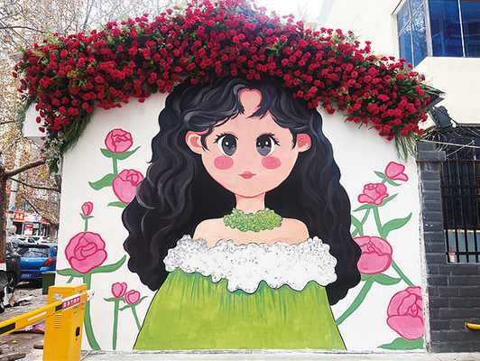 “创作时就有不少市民围观,大家都特别感兴趣,一直问我什么时候能画好,想来拍照。”侯芳荣告诉记者,看到不少人在墙前打卡,她非常高兴。她表示,自己从事美术相关工作多年,此前在各地见过不少成为网红景点的绘画打卡墙,那些充满创意和艺术感的墙绘让她印象深刻。于是,她便想着在家乡也打造一幅,既可以提升家乡的知名度和热度,也能为大家提供一个充满艺术氛围的休闲空间。在墙绘画好后,花店主人也十分满意,还特意在“花房姑娘”头顶位置插了一圈玫瑰花,宛如一顶生动的花冠,为墙绘增添了几分灵动的趣味。