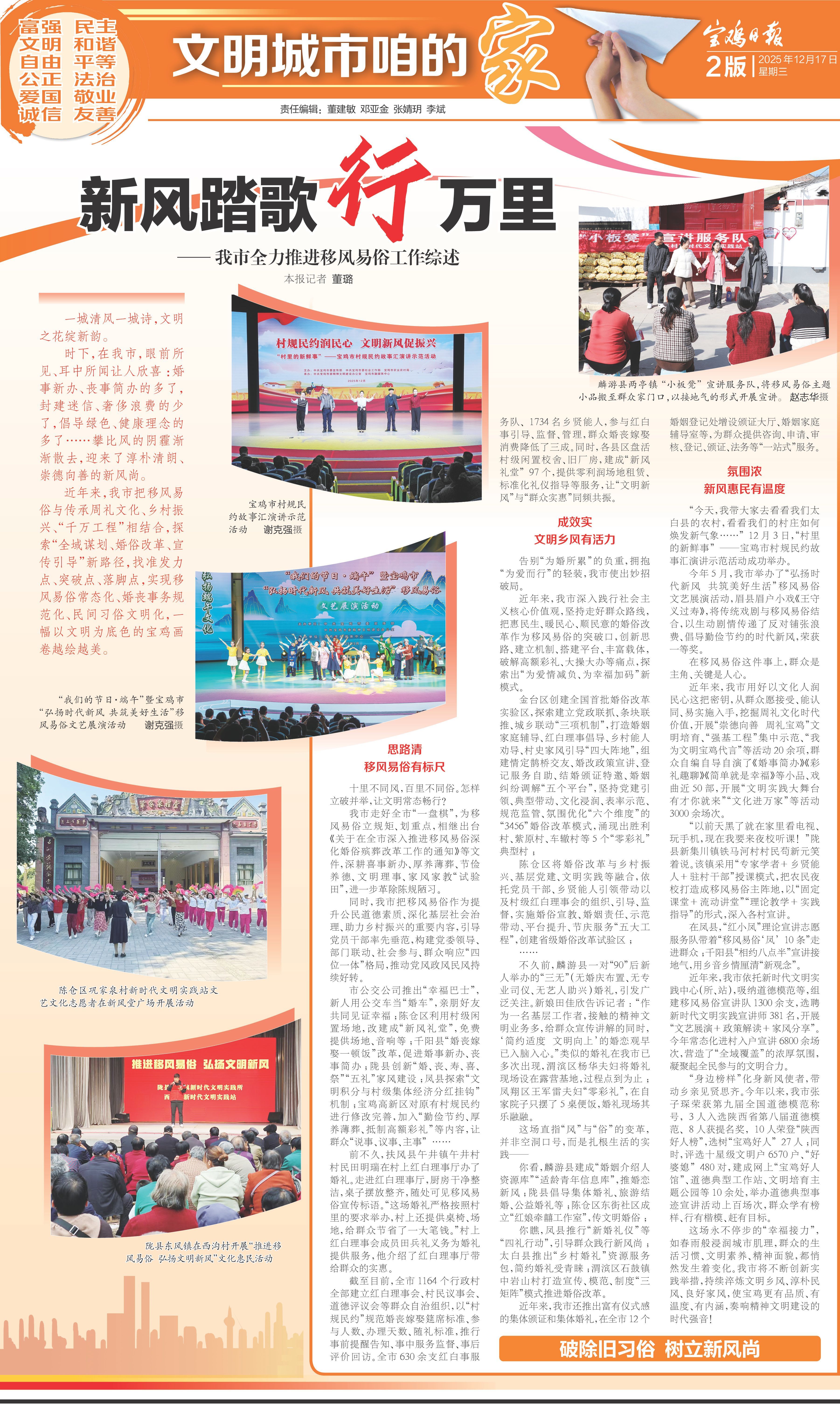 市公交公司推出“幸福巴士”,新人用公交车当“婚车”,亲朋好友共同见证幸福;陈仓区利用村级闲置场地,改建成“新风礼堂”,免费提供场地、音响等;千阳县“婚丧嫁娶一顿饭”改革,促进婚事新办、丧事简办;陇县创新“婚、丧、寿、喜、祭”“五礼”家风建设;凤县探索“文明积分与村级集体经济分红挂钩”机制;宝鸡高新区对原有村规民约进行修改完善,加入“勤俭节约、厚养薄葬、抵制高额彩礼”等内容,让群众“说事、议事、主事”……
