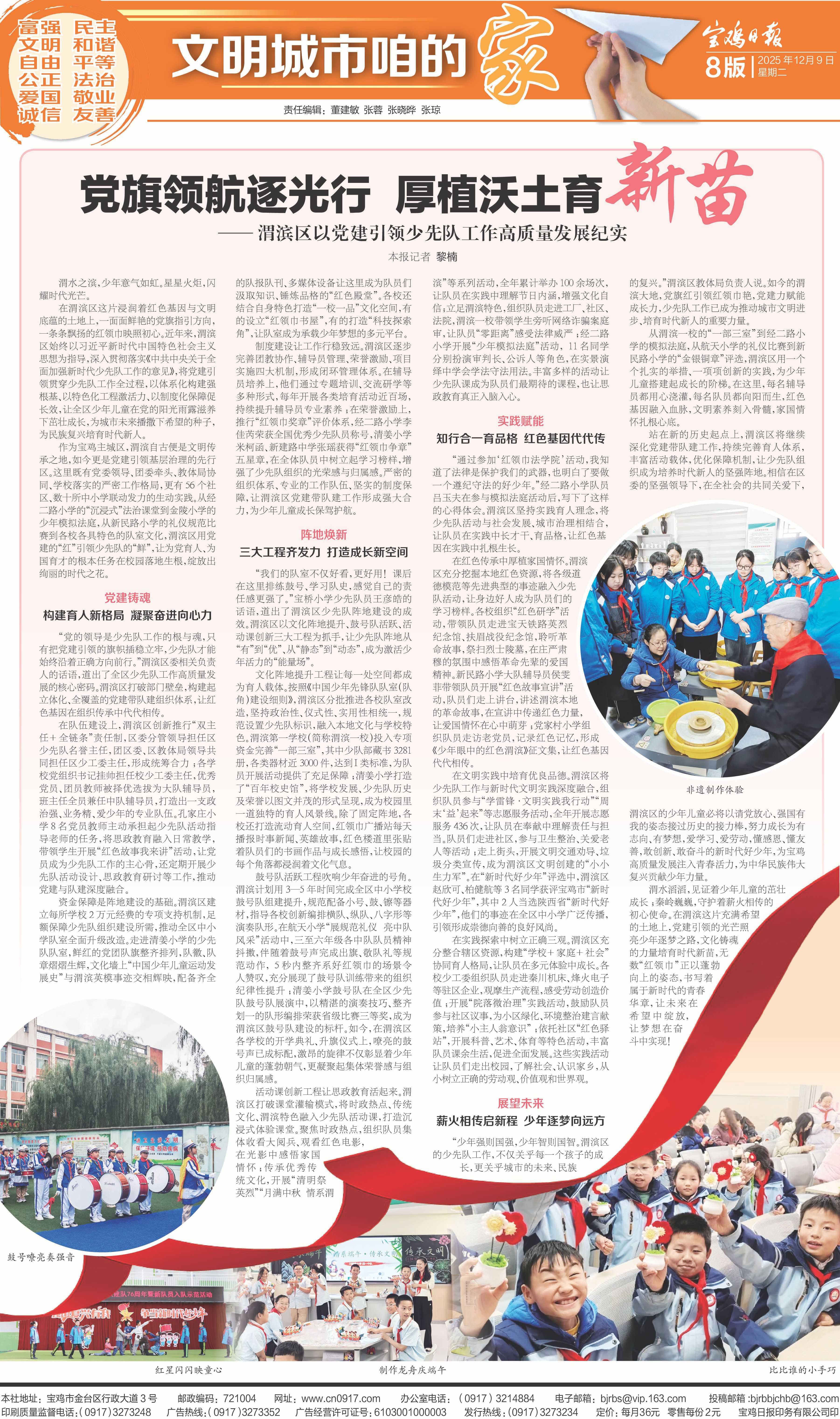 渭水滔滔,见证着少年儿童的茁壮成长;秦岭巍巍,守护着薪火相传的初心使命。在渭滨这片充满希望的土地上,党建引领的光芒照亮少年逐梦之路,文化铸魂的力量培育时代新苗,无数“红领巾”正以蓬勃向上的姿态,书写着属于新时代的青春华章,让未来在希望中绽放,让梦想在奋斗中实现!(宝鸡融媒 黎楠)