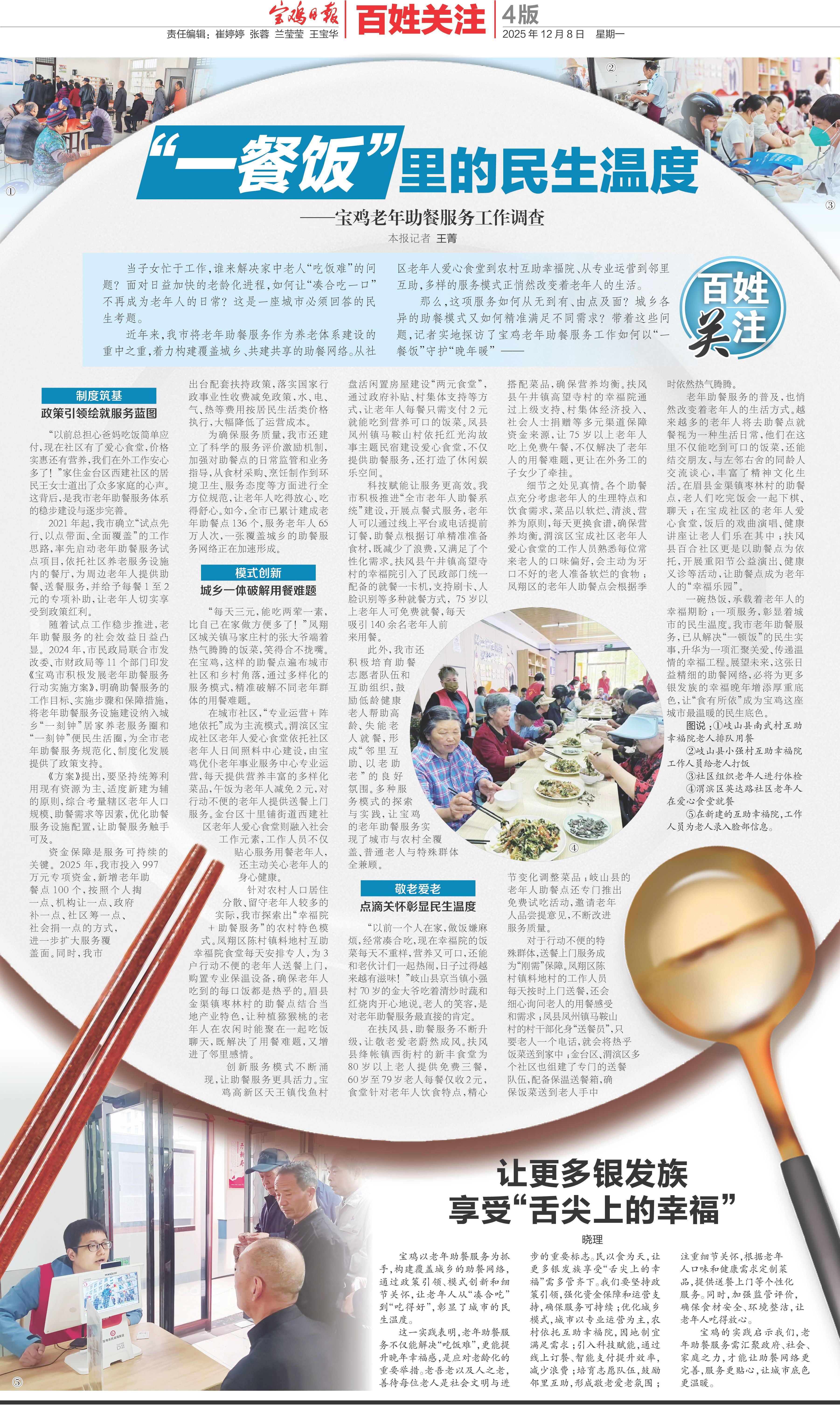 宝鸡以老年助餐服务为抓手,构建覆盖城乡的助餐网络,通过政策引领、模式创新和细节关怀,让老年人从“凑合吃”到“吃得好”,彰显了城市的民生温度。