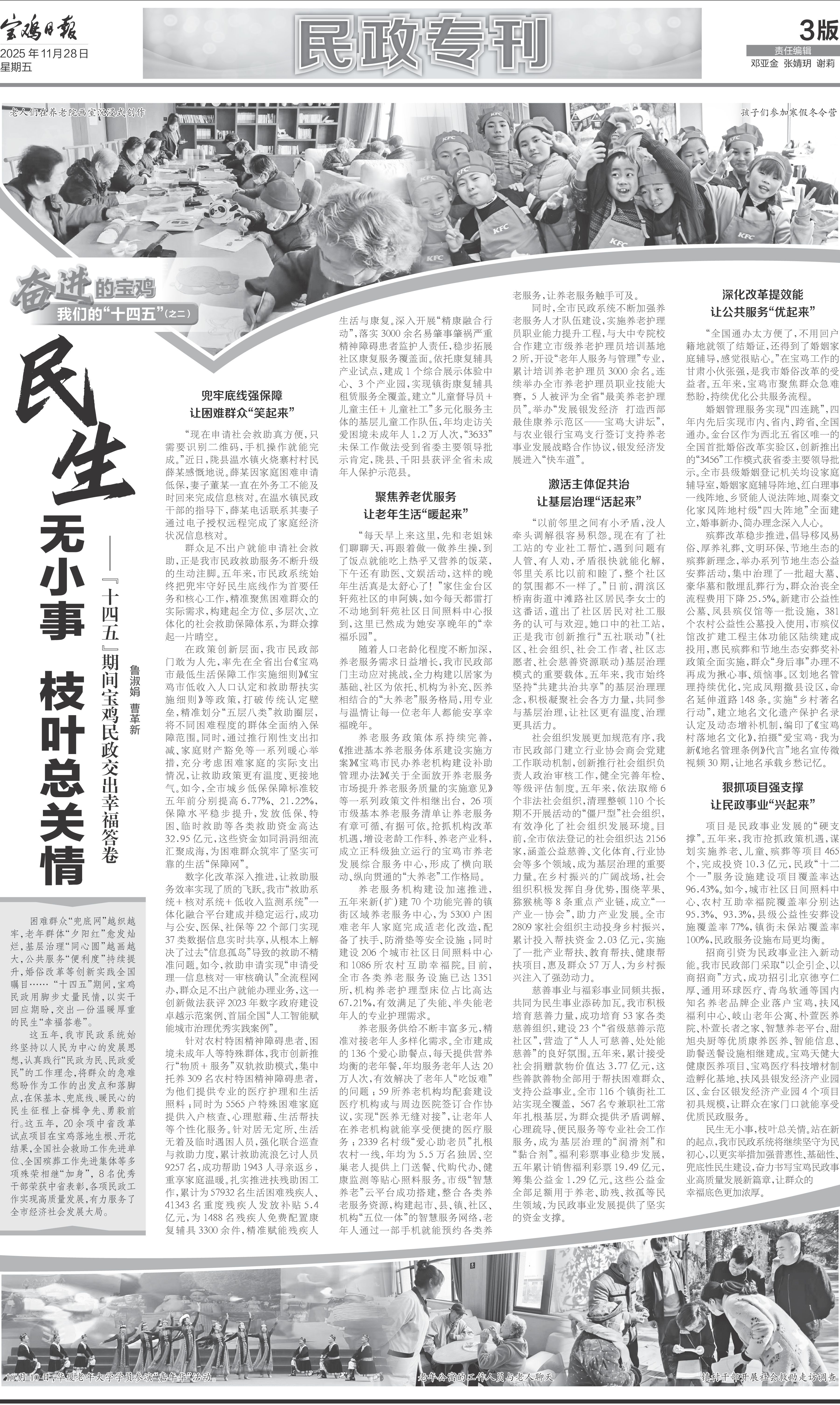 困难群众“兜底网”越织越牢,老年群体“夕阳红”愈发灿烂,基层治理“同心圆”越画越大,公共服务“便利度”持续提升,婚俗改革等创新实践全国瞩目……“十四五”期间,宝鸡民政用脚步丈量民情,以实干回应期盼,交出一份温暖厚重的民生“幸福答卷”。