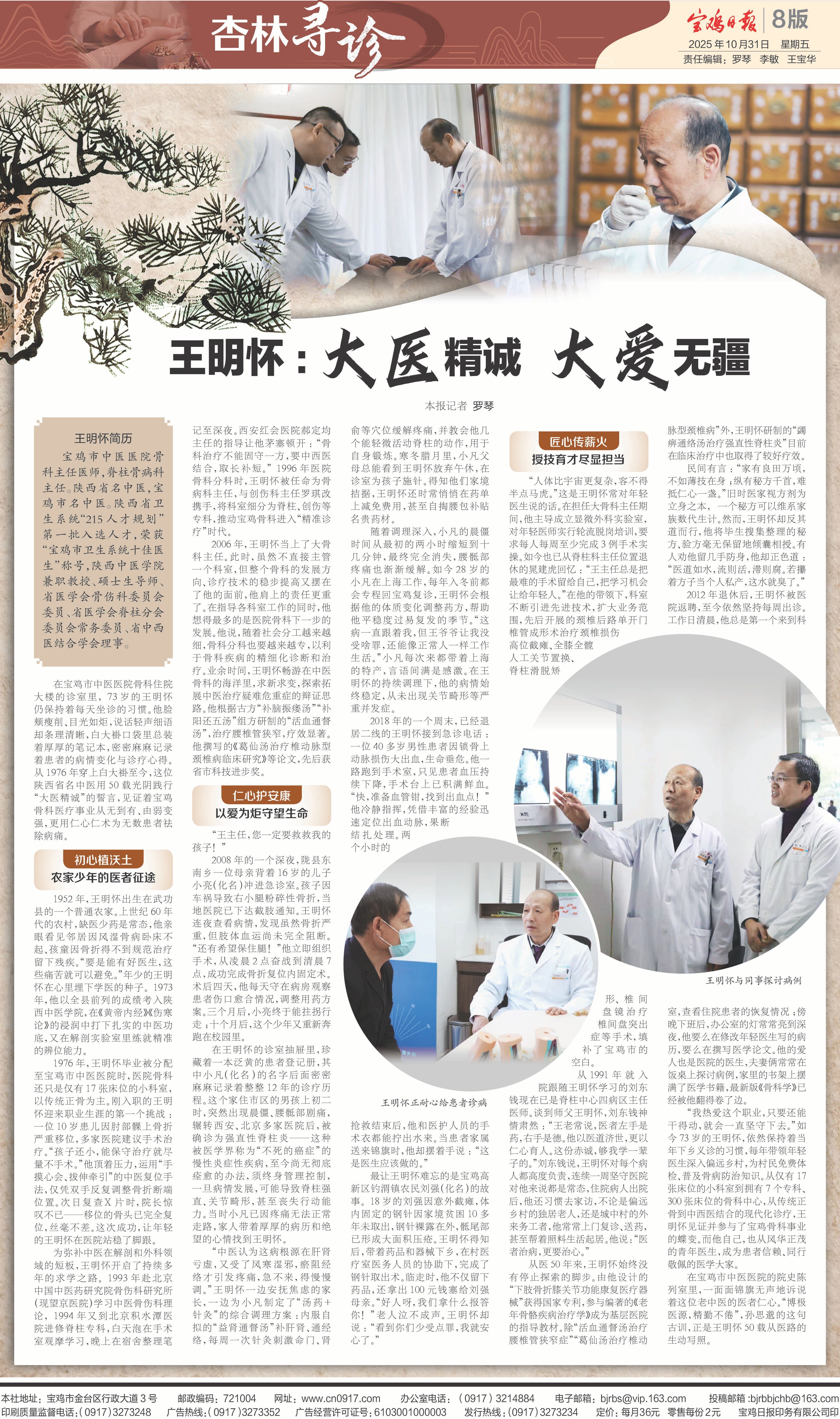 “我热爱这个职业,只要还能干得动,就会一直坚守下去。”如今73岁的王明怀,依然保持着当年下乡义诊的习惯,每年带领年轻医生深入偏远乡村,为村民免费体检、普及骨病防治知识。从仅有17张床位的小科室到拥有7个专科、300张床位的骨科中心,从传统正骨到中西医结合的现代化诊疗,王明怀见证并参与了宝鸡骨科事业的蝶变。而他自己,也从风华正茂的青年医生,成为患者信赖、同行敬佩的医学大家。