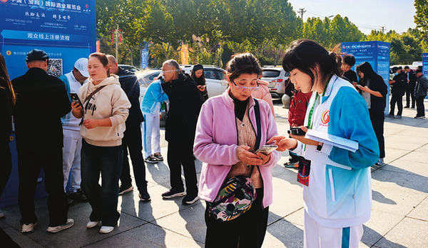 本届展会前,连绵的秋雨使得气温下降,但在展会信息注册处,志愿者们仍旧冒雨坚守,耐心地辅导每一位前来参观的群众完成信息注册。在这来来往往的人群中,志愿者许可思怡在雨中为七旬老人调试手机的画面被镜头定格。“爷爷您看,这样操作就能生成酒展会入场码。”她一边耐心讲解,一边用纸巾为老人擦拭被雨水打湿的手机。