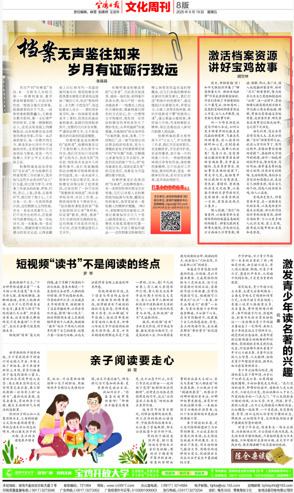 宝鸡历史悠久,档案资源丰富,是一座档案文化的宝库。以高度的责任感充分挖掘、活化利用这些珍贵的档案资源,讲好宝鸡故事,可以让更多的人认识宝鸡、爱上宝鸡,提升我们城市的知名度和美誉度。