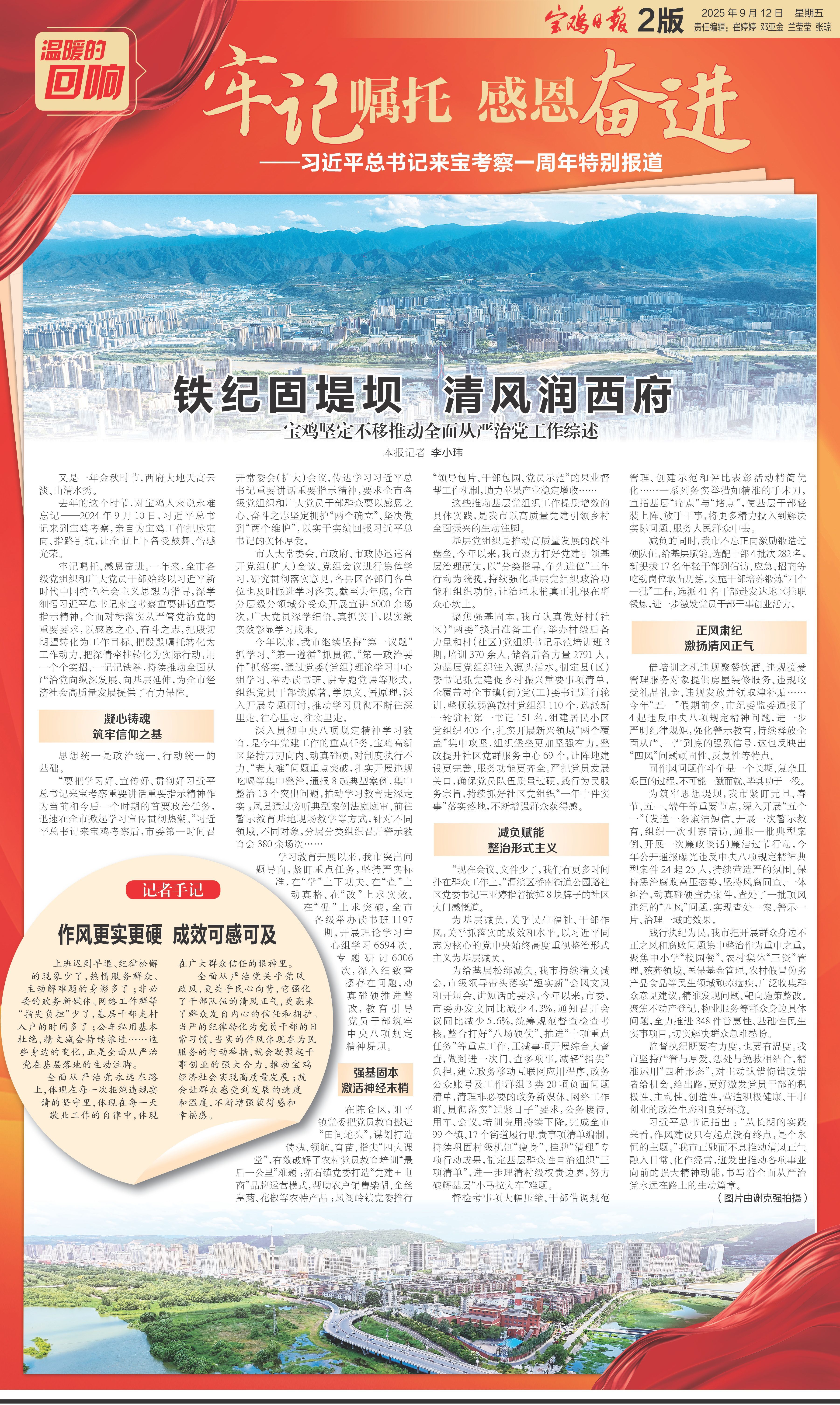 全面从严治党关乎党风政风,更关乎民心向背,它强化了干部队伍的清风正气,更赢来了群众发自内心的信任和拥护。当严的纪律转化为党员干部的日常习惯,当实的作风体现在为民服务的行动举措,就会凝聚起干事创业的强大合力,推动宝鸡经济社会实现高质量发展;就会让群众感受到发展的速度和温度,不断增强获得感和幸福感。