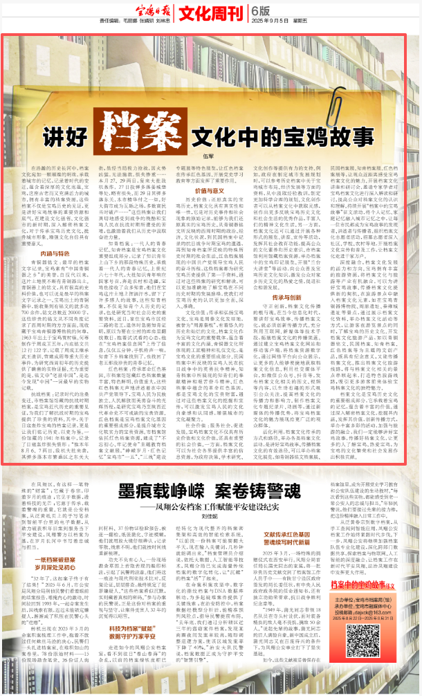 在浩瀚的历史长河中,档案文化宛如一颗璀璨的明珠,承载着城市的记忆,记录着时代的变迁,蕴含着深厚的文化底蕴。宝鸡,这座古老而又充满活力的城市,拥有丰富的档案资源,这些档案不仅是宝鸡历史的见证,更是讲好宝鸡故事的重要资源和底气。在建设文化强省、文化强市的新时期,深入解密档案文化,对于传承宝鸡历史文化、提升城市形象、增强文化自信具有重要意义。
