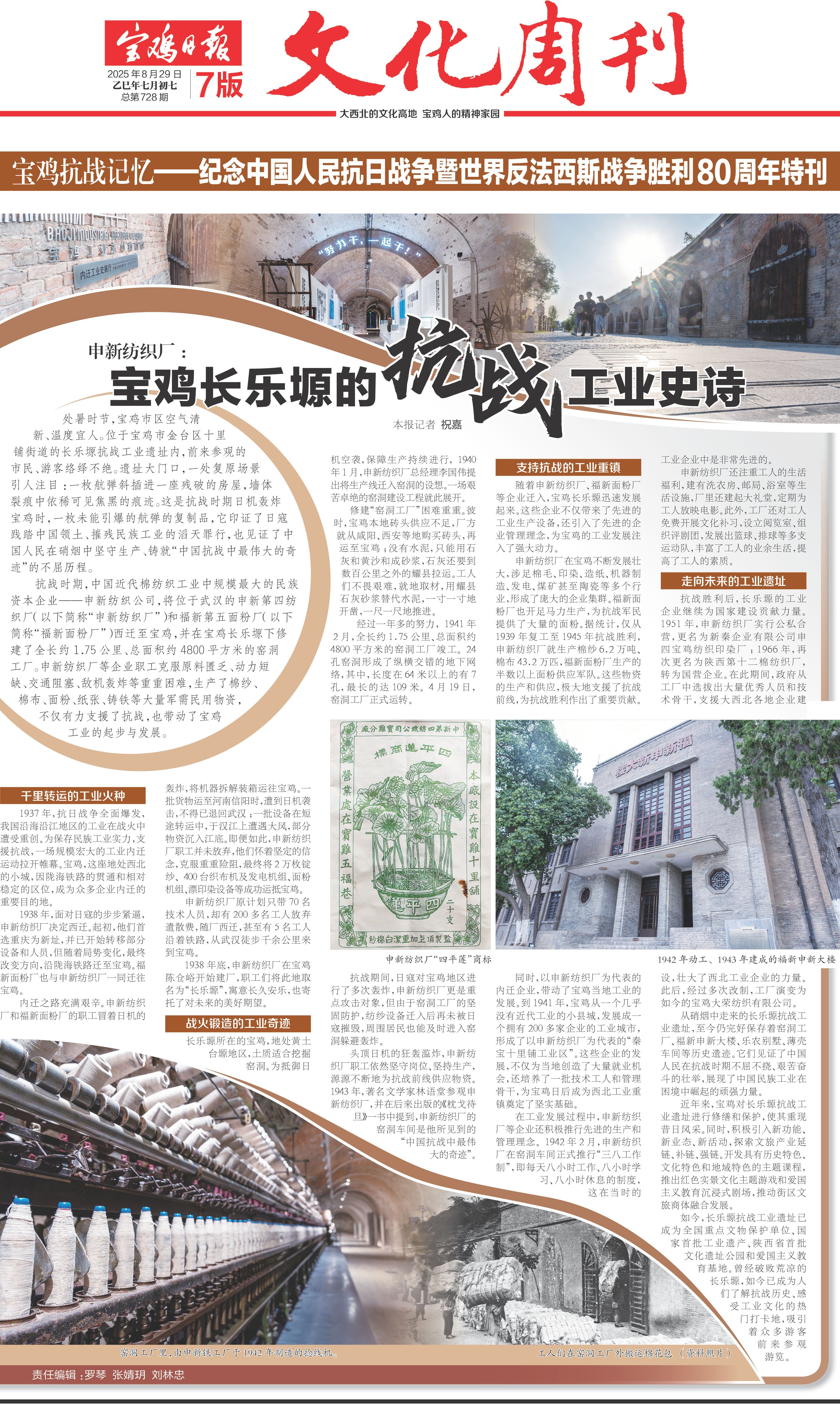 抗战时期,中国近代棉纺织工业中规模最大的民族资本企业——申新纺织公司,将位于武汉的申新第四纺织厂(以下简称“申新纺织厂”)和福新第五面粉厂(以下简称“福新面粉厂”)西迁至宝鸡,并在宝鸡长乐塬下修建了全长约1.75公里、总面积约4800平方米的窑洞工厂。申新纺织厂等企业职工克服原料匮乏、动力短缺、交通阻塞、敌机轰炸等重重困难,生产了棉纱、棉布、面粉、纸张、铸铁等大量军需民用物资,不仅有力支援了抗战,也带动了宝鸡工业的起步与发展。