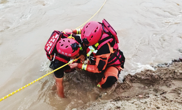 8月10日18时13分,市消防指挥中心接到报警,称眉县横渠镇古城村河道中有人员被困。接到报警后,消防队员立即赶赴现场。此时,6名作业人员被困在河道的孤岛上,孤岛距离岸边有八九米,浑浊汹涌的河水裹挟着泥沙奔腾而下,作业人员根本无法自行渡河,情况十分危急。消防员迅速制定救援方案,先由一名水域救援专业队人员在岸边做好锚点固定,随后救援人员游至河道中间,利用抛绳包将救生衣和头盔送至孤岛,依次将被困人员救出。