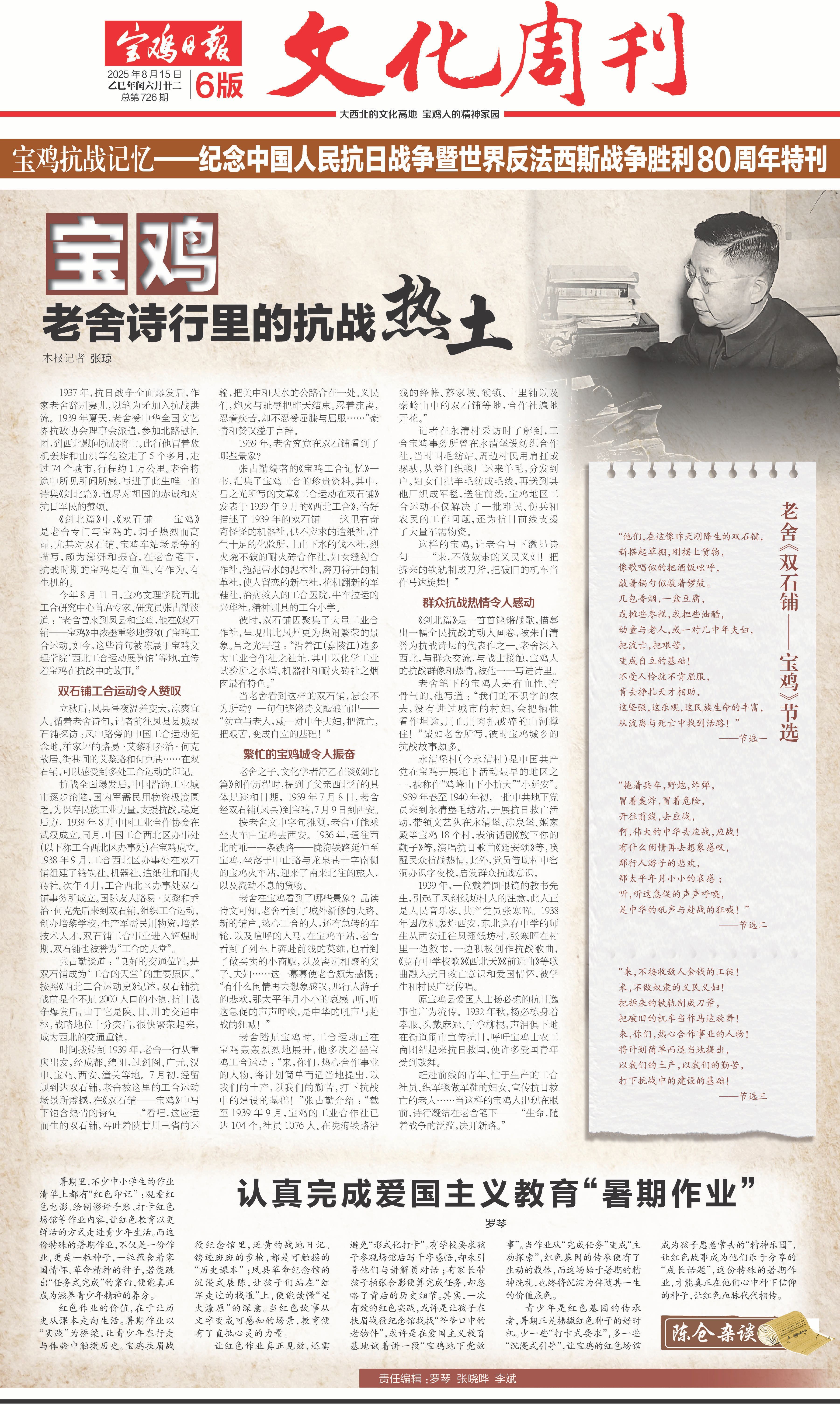 赶赴前线的青年、忙于生产的工合社员、织军毯做军鞋的妇女、宣传抗日救亡的老人……当这样的宝鸡人出现在眼前,诗行凝结在老舍笔下——“生命,随着战争的泛滥,决开新路。”(宝鸡融媒 张琼)