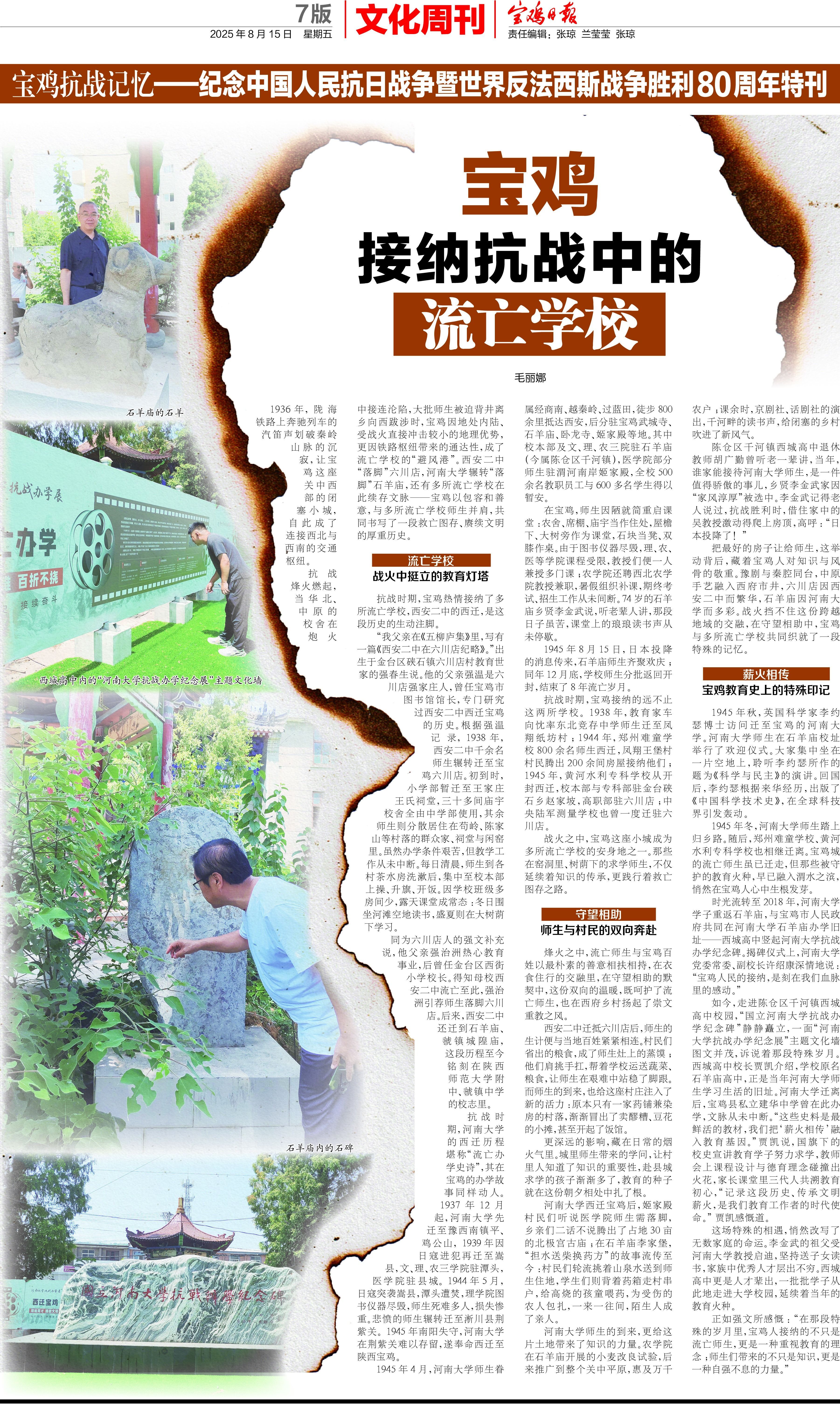 如今,走进陈仓区千河镇西城高中校园,“国立河南大学抗战办学纪念碑”静静矗立,一面“河南大学抗战办学纪念展”主题文化墙图文并茂,诉说着那段特殊岁月。西城高中校长贾凯介绍,学校原名石羊庙高中,正是当年河南大学师生学习生活的旧址。河南大学迁离后,宝鸡县私立建华中学曾在此办学,文脉从未中断。“这些史料是最鲜活的教材,我们把‘薪火相传’融入教育基因。”贾凯说,国旗下的校史宣讲教育学子努力求学,教师会上课程设计与德育理念碰撞出火花,家长课堂里三代人共溯教育初心,“记录这段历史、传承文明薪火,是我们教育工作者的时代使命。”贾凯感慨道。