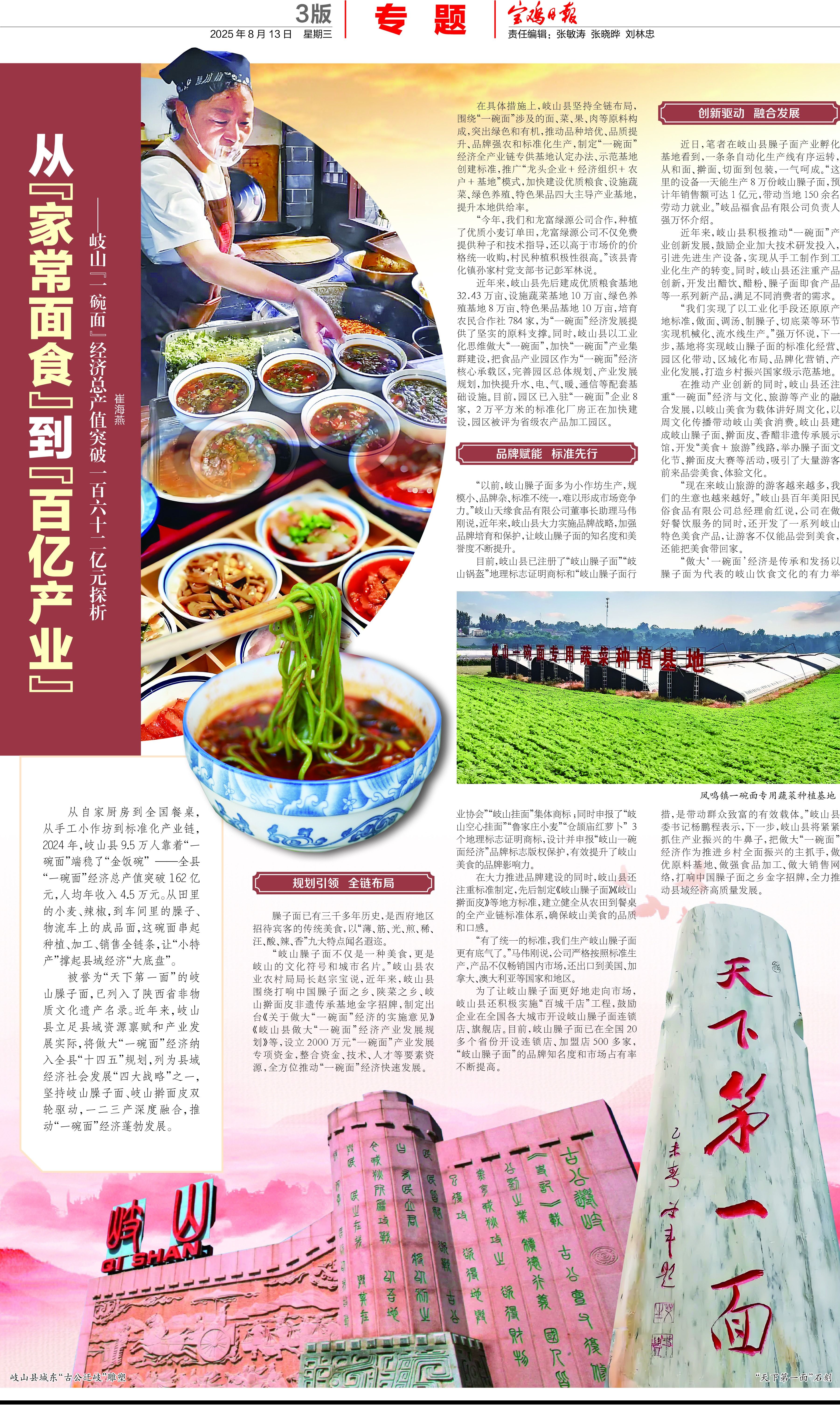 从自家厨房到全国餐桌,从手工小作坊到标准化产业链,2024年,岐山县9.5万人靠着“一碗面”端稳了“金饭碗”——全县“一碗面”经济总产值突破162亿元,人均年收入4.5万元。从田里的小麦、辣椒,到车间里的臊子、物流车上的成品面,这碗面串起种植、加工、销售全链条,让“小特产”撑起县域经济“大底盘”。