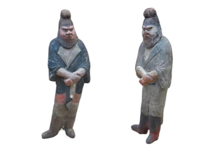 不同之处在于,这件胡俑的帽子、眉毛、眼睛、胡髯、飘带均用墨色描绘而成,而靴子为朱红色。