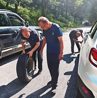 事情是这样的。8月8日上午,曾女士与两位亲友自驾前往黄柏塬景区途中,车辆突然发出尖锐的警报声,三人下车查看,发现左前轮胎爆胎,更棘手的是,三人均为年过六旬的老年人,面对笨重的备胎和复杂的换胎流程束手无策。此时正值正午时分,而且这里手机也没有信号。