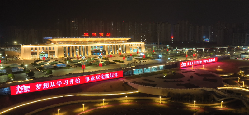 “‘学习强国’照亮宝鸡楼体灯光秀”活动,宝鸡各大建筑纷纷扮上“红装”。
