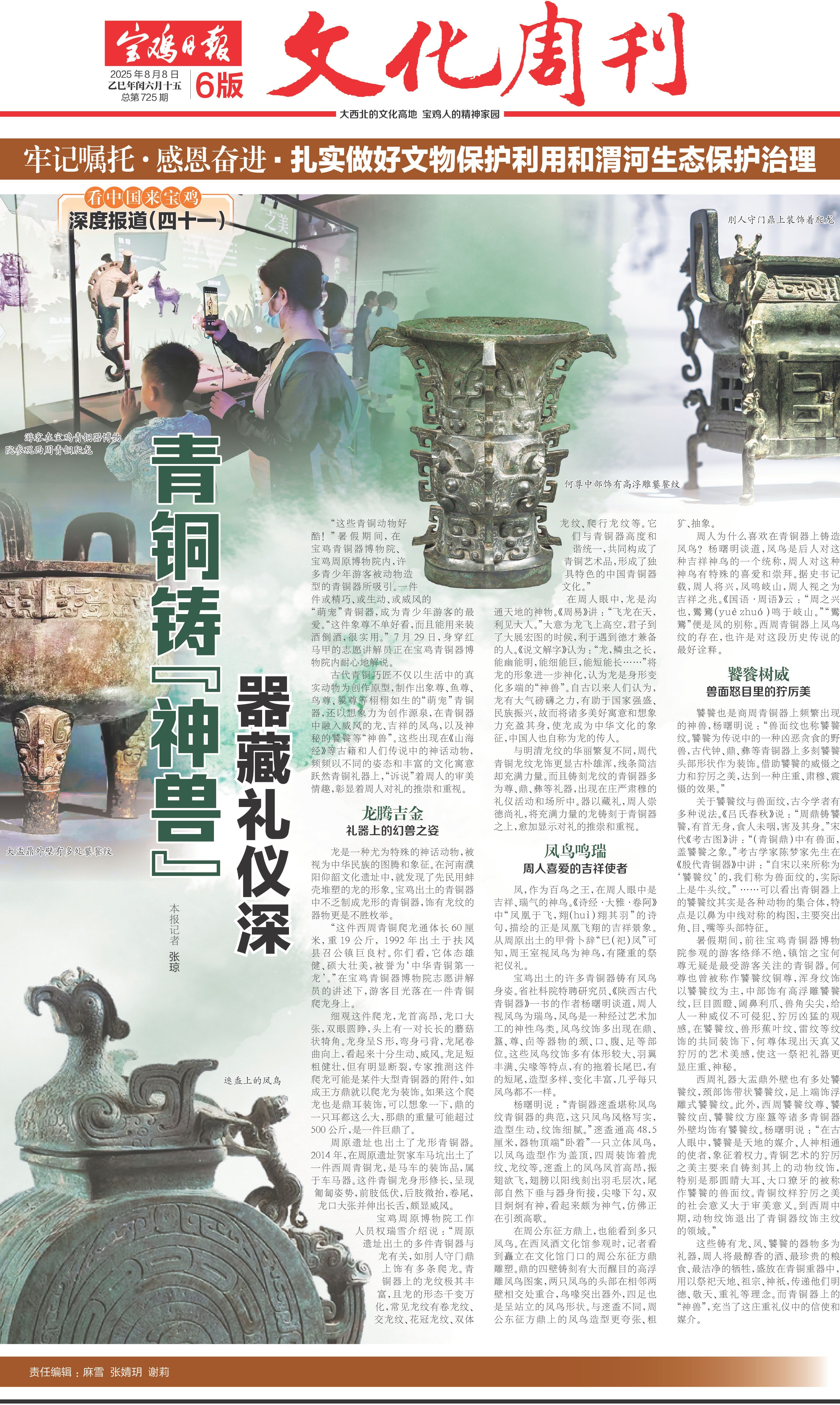 这些铸有龙、凤、饕餮的器物多为礼器,周人将最醇香的酒、最珍贵的粮食、最洁净的牺牲,盛放在青铜重器中,用以祭祀天地、祖宗、神祇,传递他们明德、敬天、重礼等理念。而青铜器上的“神兽”,充当了这庄重礼仪中的信使和媒介。(宝鸡融媒 张琼)