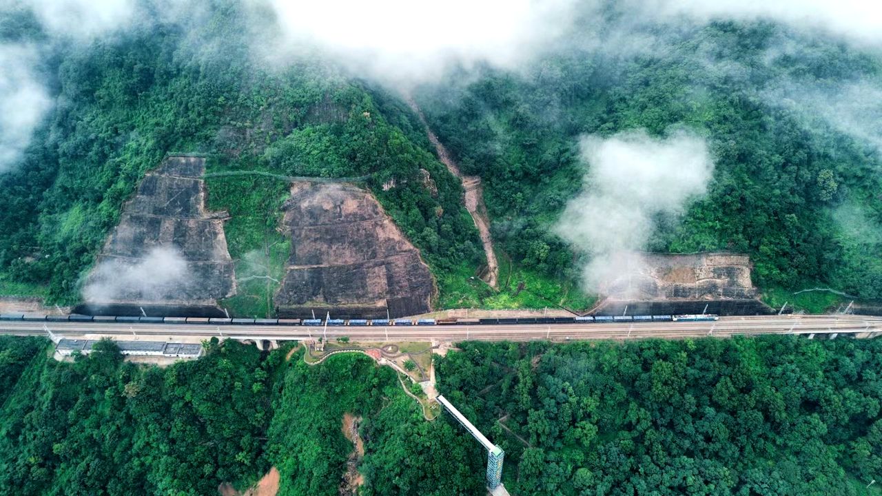 山脚下,一列货车风笛长鸣,呼啸驶过,打破了群山的寂静。
