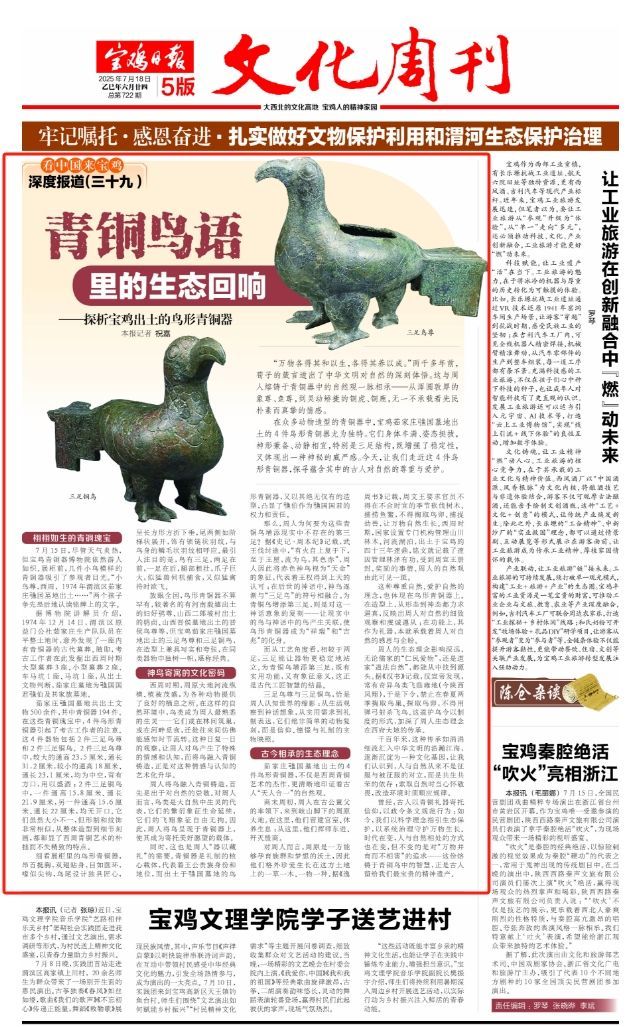 曾经,古人以青铜礼器寄托信仰,以政令条文规范行为;如今,我们以科学理念指引生态保护,以系统治理守护万物生长。时代在变,人与自然相处的方式也在变,但不变的是对“万物并育而不相害”的追求——这份熔铸于青铜鸟中的智慧,正是古人留给我们最宝贵的精神遗产。(宝鸡融媒记者 祝嘉)