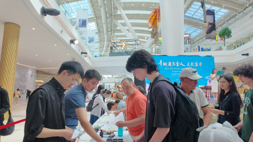 国之交在于民相亲。文化市集特别设置了“礼乐通关文牒”互动环节,让哈萨克斯坦广大民众通过亲手在宣纸上拓印“宅兹中国”等复刻纹样,了解青铜文化。现场还准备了毛笔、墨汁,以及3米长的“青铜遇见金人”丝路长卷,不少外国友人手握毛笔,精心绘制出他们心中的中哈友谊标识。