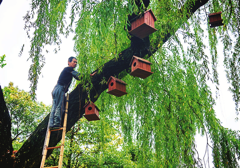 目前,这些鸟笼吸引了喜鹊、布谷鸟、燕子等在此安家落户。园区还注意保护乔木上的天然鸟巢,安排专人每日清洁环境,为鸟儿打造宜居的家。