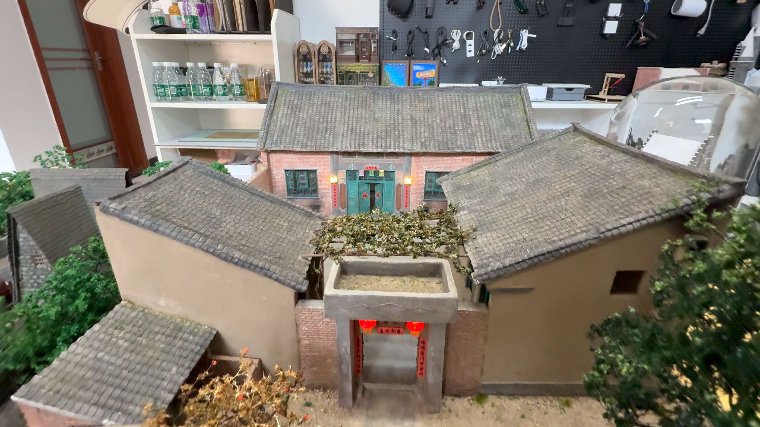 走进赵炜箫的微缩模型工作室,只见他手拿刻刀,正雕刻西府老街牌坊,作品展示台上,一座极具关中特色的老宅格外引人注目。斑驳的绿色大门,院内葡萄满架、绿树成荫,鸡笼上压着砖头,铁锨上带着泥土,在这座被缩小了35倍的农家小院内,一件件老物件瞬间将人们的记忆拉回到上世纪八九十年代。