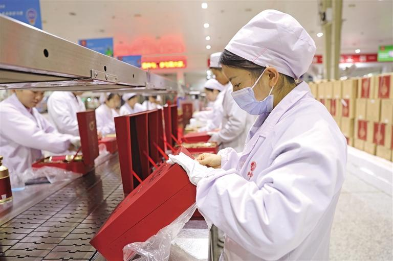 西凤酒现代化成品包装车间里,工人在打包产品(资料照片)。 受访单位供图