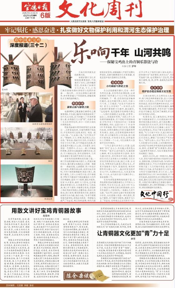 在宝鸡青铜器博物院的展厅里,记者也看到悬挂及摆放着的七个同样大小的铜铃。郑苗告诉记者,这些1987年出土于陇县东南镇边家庄村的铜铃,因为其形体娇小、形制相同,一直被认为是车马器。“我们常见的车马器中有圆圆的镂空状铃,也有好像小风扇一样的銮铃,而这个铜铃,有可能作为配饰,悬挂于马车上。”郑苗说,宝鸡地区出土的铃并不多,而学术界关于铜铃的探讨却从未停止。《诗经》中有“龙旂阳阳,和铃央央”,形容军旅的气势,也说明铃的广泛应用。而青铜乐器铙、钲、铎、钟等,也被视为由铃发展而来。