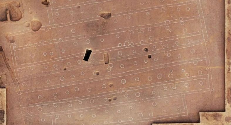 王家嘴二号建筑年代为战国晚期,东西宽41米,南北长30米,面积超1200平方米,初步判断为干栏式大型粮仓。