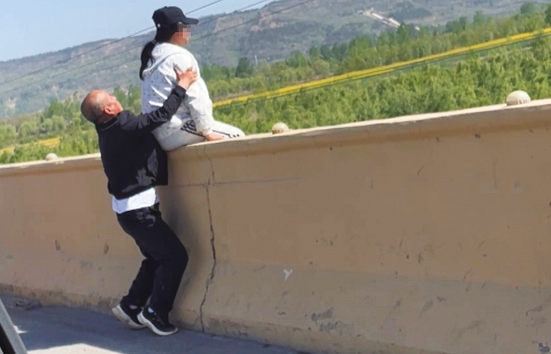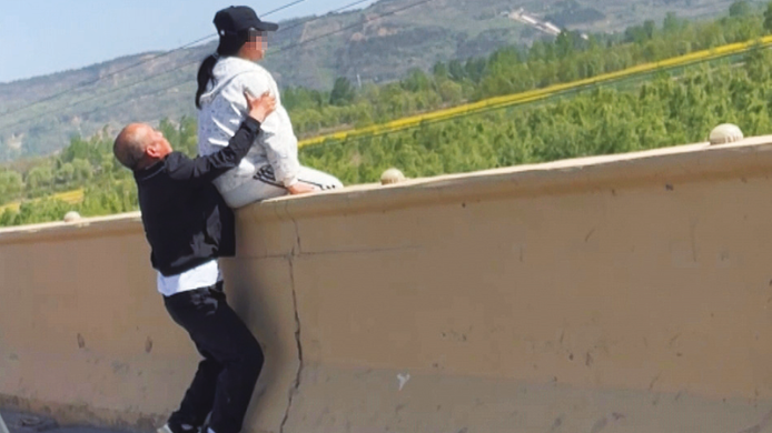 当天9时许,魏红波与朋友驾车行驶至眉县渭河大桥上时,发现一名女孩坐在桥边护栏上,低垂着头,看起来情绪低落。他立即对朋友说:“这女孩情况不对,咱们先停车看看。”车辆刚停稳,女孩的身体就开始向桥下倾斜。危急时刻,魏红波迅速飞奔上前,趁女孩不备从背后将她紧紧抱住(见右图),并移动至桥面的安全区域。被救后,女孩情绪非常激动,魏红波担心再次发生意外,立即让朋友报警求助,并从车上拿来矿泉水递给女孩。此时,一名路过的群众也赶了过来,轻声安慰女孩,让她不要害怕。待民警赶到现场后,3人才放心离开。