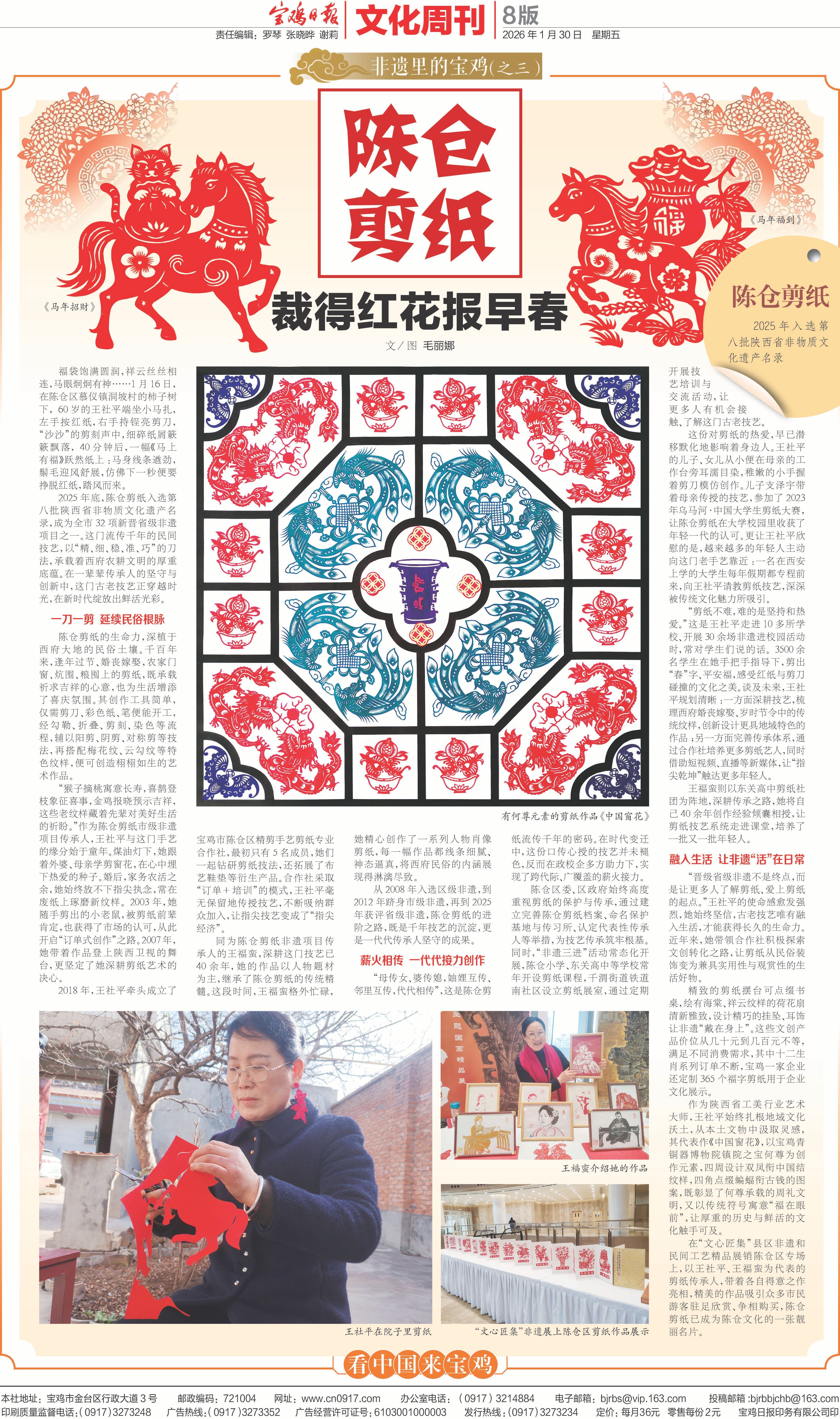 2025年底,陈仓剪纸入选第八批陕西省非物质文化遗产名录,成为全市32项新晋省级非遗项目之一。这门流传千年的民间技艺,以“精、细、稳、准、巧”的刀法,承载着西府农耕文明的厚重底蕴。在一辈辈传承人的坚守与创新中,这门古老技艺正穿越时光,在新时代绽放出鲜活光彩。