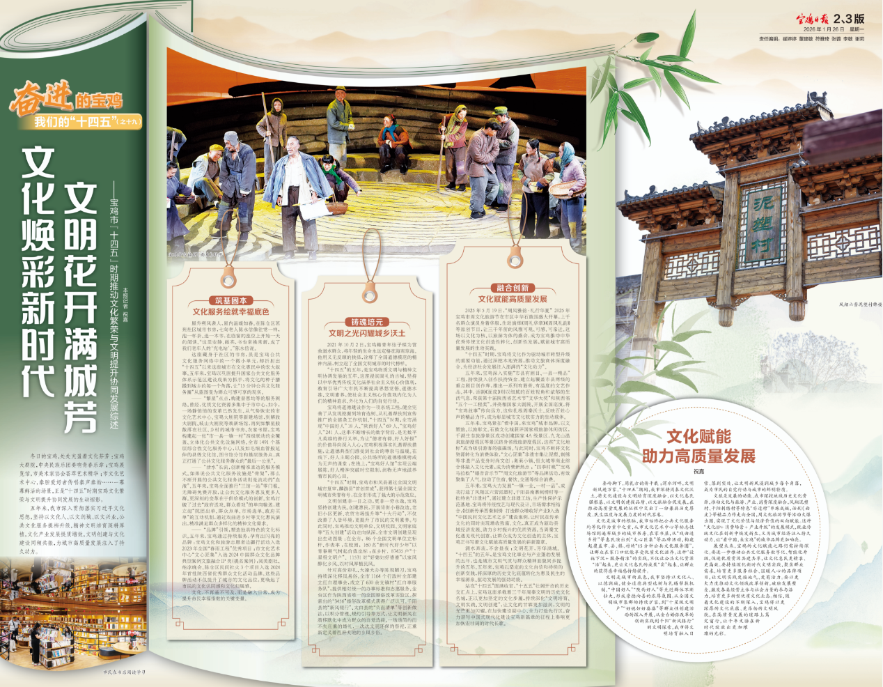 站在“十四五”圆满收官、“十五五”壮阔开启的历史交汇点上,宝鸡这座承载着三千年周秦文明的历史文化名城,正以更加坚定的文化步履,持续深化“文明培育、文明实践、文明创建”,让文化的甘霖更加滋润,文明的光芒更加闪耀,在加快建设副中心、全力打造先行区,奋力谱写中国式现代化建设宝鸡新篇章的征程上奏响更加恢宏壮阔的时代长歌。